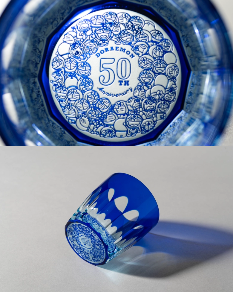 - 底には50体のドラえもんが彫刻されており、お水を注ぐと側面にドラえもんが反射し増えていきます。50年にとどまらず、この先何百年も日本の文化として繁栄して欲しいという願いを切子に込めました。