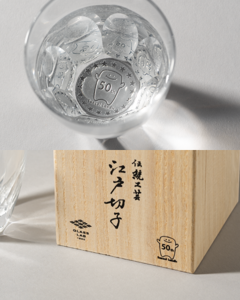 - 創業50年を記念し、同社のキャラクターである「底地くん」を彫刻した江戸切子を制作したいとご依頼いただきました。