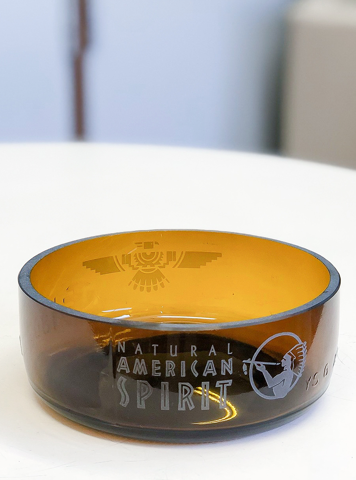 - わたしたちのガラス加工技術が集約されたプロジェクトです。廃棄予定の一升瓶を“切断”して切断面を“磨き”、“角の面取り”、“レスト(タバコ置き部分)の加工”を施し、更に“サンドブラスト”でアメリカン スピリット様のロゴマークを入れた逸品です。おそらく全ての加工をワンストップで出来るガラス加工会社は、国内にはわたしたち以外にいないかもしれません。